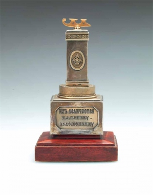 Еще одна интересная тема связана с неизвестной дореволюционной наградой. В произведениях Николая Александровича это событие не отражено по вполне понятным причинам. Но императорская семья достойно отметила заслуги первого олимпийского чемпиона России. Для этой цели был подготовлен памятный подарок в виде триумфальной колонны из серебра, увенчанной золотым коньком. На подарке надпись: «ИХ ВЕЛИЧЕСТВА Н.А.ПАНИНУ-КОЛОМЕНКИНУ». Этот изящный приз высотой 16 см был подготовлен мастером и владельцем фабрики золотых и серебряных изделий Матреной Андреевной Андреевой. Подарок Николай Александрович получил за заслуги перед Отечеством из рук Николая II и Александры Федоровны.